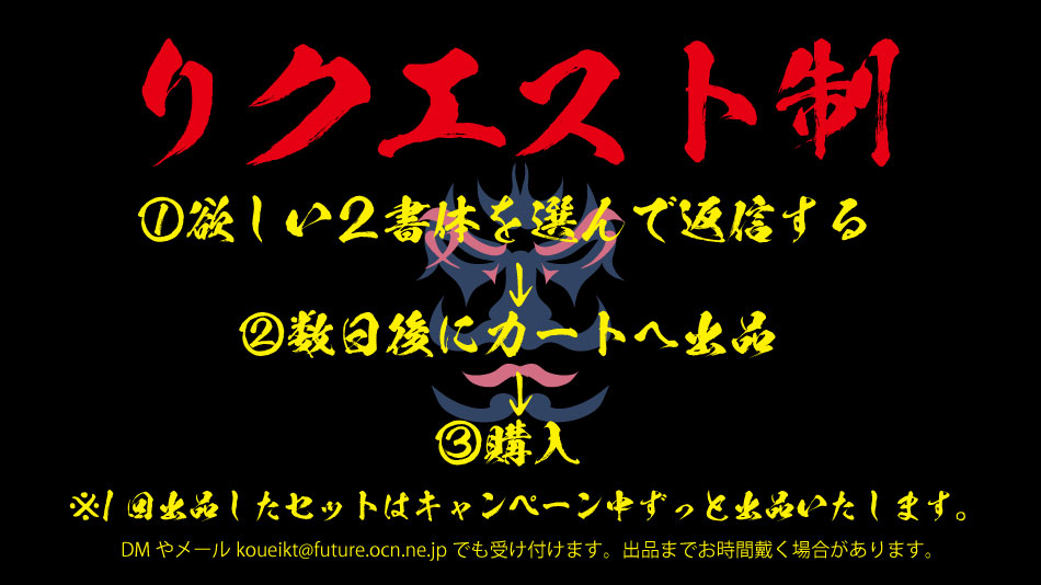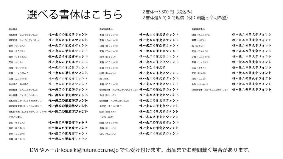 | お好みの書体を2書体を選んでください リクエスト制 リクエストを追加していきます >>復活祭<< リクエストは昭和書体公式XのDMやポストに返信、メールでも受け付けております。 お気軽にどうぞ。 公式X ポストに返信 https://x.com/showashotai/status/1984054439951659102 メールに送信 |